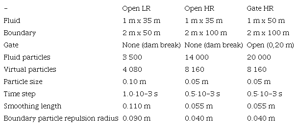 All solid boundaries, including the static sluice gate when applicable, were modelled using a single line of virtual particles spaced evenly at Dx/2; their behavior was modeled with the Monaghan repulsive force equation [14], which affects nearing fluid particles only when within a certain range r0 of the boundary and becomes higher in inverse proportion to the distance between the boundary particle and the fluid particle (this proportionality can be adjusted empirically by the user). No turbulence models or correction factors were applied. Time step was constant and chosen using the Verlet criteria [11], which is based on expected numerical propagation of data. Iterations were set to continue up to a physical time of t = 5.0 s. All other significant parameters varied according to particle size and boundary dimensions, and are specified in Table 1 for each of the three variants used for this study.