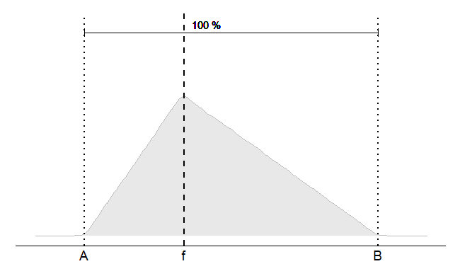 Como parte de las estrategias utilizadas en todas estas referencias, las magnitudes de interés son tratadas como variables aleatorias, de manera que puedan ser descritas a través de distribuciones de probabilidad que a su vez se utilizan para estimar su variabilidad asociada o sus intervalos de variación, es decir, su incertidumbre estándar y su incertidumbre expandida [5,6]. Dentro de las distribuciones más comunes, sobresale la distribución triangular. Esta distribución, como su nombre lo indica, consiste en un triángulo y es caracterizada por tres parámetros: su moda o valor más probable f (correspondiente al punto más alto del triángulo), su valor extremo o límite inferior A y su valor extremo o límite superior B. De esta forma, se espera que dentro del intervalo comprendido entre los límites A y B, denominado intervalo de cobertura, se encuentre el 100 % de todos los posibles valores de la magnitud de interés. En la Fig. 1 se presenta un ejemplo de una distribución triangular.