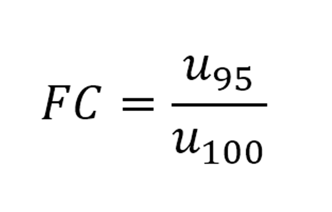Finalmente, para lograr la evaluación de la validez de los factores de corrección abordados en el presente estudio, es necesario establecer su metodología de estimación como una relación entre las incertidumbres estándar estimadas u 95 y u 100. La relación propuesta se muestra en la ecuación (4), donde FC corresponde al factor de corrección de interés.