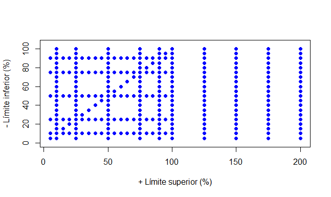 Como se mencionó anteriormente, para lograr la estimación de incertidumbres mediante el ajuste de una distribución triangular, se requiere un valor central y dos valores extremos que delimiten la distribución. Las diferentes combinaciones de estos valores definen la forma y comportamiento que tendrá el triángulo evaluado. Para el presente estudio se simularon diferentes combinaciones de valores centrales y valores extremos que abarcaron una amplia gama de posibles escenarios. Los valores centrales f considerados incluyeron 11 diferentes datos comprendidos entre 0.01 y 10. Por su parte, los valores extremos inferiores se definieron en función del valor central, restando entre el 5 % y el 100 % de dicho valor, mientras que los valores extremos superiores se definieron de forma homóloga, sumando entre el 5 % y el 200 % del valor central. La diferencia se basa en que los factores de emisión de GEI no pueden ser menores a -100 % de su valor (negativos), pero sí pueden tener valores superiores a +100 % de su valor. Esta situación responde a que los factores considerados cuantifican cantidades de gas emitidas, y dado que físicamente las cantidades de sustancia (gas) no pueden ser menores a 0, factores negativos implicarían cantidades “removidas” en lugar de “emitidas”, cambiando su definición e interpretación teórica. Por su parte, el valor de 200 % se definió debido a que los intervalos de incertidumbre (variación) de los factores de emisión de GEI publicados en la lista nacional oficial por el Instituto Meteorológico Nacional (IMN) [10] tienen este valor como límite superior máximo. En la Fig. 2 se muestran todas las 284 combinaciones de límites inferiores y superiores consideradas para cada uno de los 11 valores centrales. De esta manera, se generó una base de datos con 3124 diferentes escenarios, cada uno de los cuales corresponde a una distribución a evaluar.