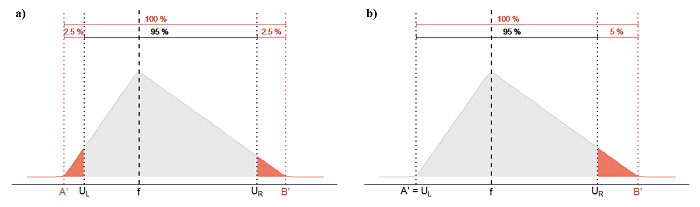 Para la estimación de los límites proyectados A’ y B’, se consideraron dos interpretaciones sobre el establecimiento o ubicación del intervalo al 95 % ( Fig. 3a y 3b). La primera interpretación, correspondiente al enfoque simétrico tradicional (proyección simétrica), parte de que el 5 % restante de la distribución se divide en un 2,5 % por debajo de U Ly un 2,5 % por encima de U R (triángulos rojos en la Fig. 3a). Esta puede considerarse cuando la variable de interés no tiene restricciones en sus posibles valores o sólo puede tener valores positivos pero el límite inferior U L se encuentra lo suficientemente lejos del 0 como para que el 2,5 % de los valores por debajo del U L no incluya valores negativos. Esto último es aplicable para la mayoría de los casos encontrados en la literatura para factores de emisión de GEI, los cuales, por su naturaleza, no pueden tener valores negativos. De esta manera, los valores de A’ y B’ pueden ser estimados geométricamente a partir del área de los dos triángulos formados por fuera del intervalo de cobertura del 95 %, mediante la solución del sistema mostrado en la ecuación (2) [12, 13].