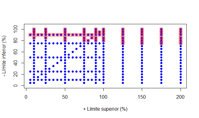 Para el caso de las incertidumbres u 95, inicialmente se aplica la ecuación (2) para todos los casos simulados para estimar los valores de A’ y B’, siendo la interpretación simétrica tradicional del intervalo de cobertura al 95 %. Sin embargo, en un 24,3 % de los casos (759 casos) se obtuvieron valores negativos para A’, lo cual corresponde a una inconsistencia para el presente estudio. La Fig. 4 presentan los escenarios en los que se presentó esta inconsistencia, señalados en rojo. En aquellos escenarios sin inconsistencias (2365 casos), los valores obtenidos de la proyección geométrica de A’ y B’ se utilizan en la ecuación (1) para obtener la incertidumbre de interés u 95. Los escenarios pertenecientes a la diagonal mostrada en la Fig. 4 corresponden a distribuciones triangulares simétricas, y constituyen un subgrupo particular de la interpretación simétrica tradicional denominada en este estudio como límites simétricos.