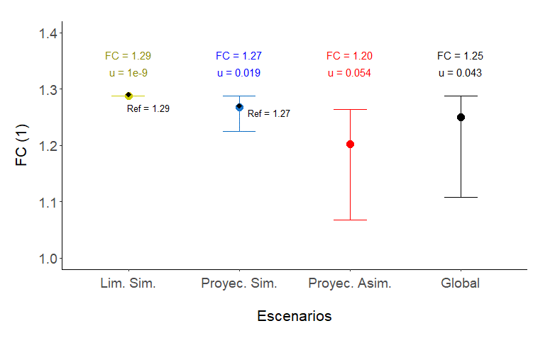 Finalmente, el cuarto y último grupo (negro) corresponde a todos los escenarios evaluados, es decir, a la combinación global de los tres grupos anteriores y contiene el 100 % de los casos (3124 casos). Para este grupo, el FC estimado es igual a 1,25. Su incertidumbre e intervalo de cobertura al 95 % presenta una clara influencia del tercer grupo de análisis, pero al incorporar el segundo grupo con valores mayores y menos variabilidad, la distribución observada se vuelve mucho más asimétrica, con un valor promedio más cercano al valor superior del intervalo de cobertura.