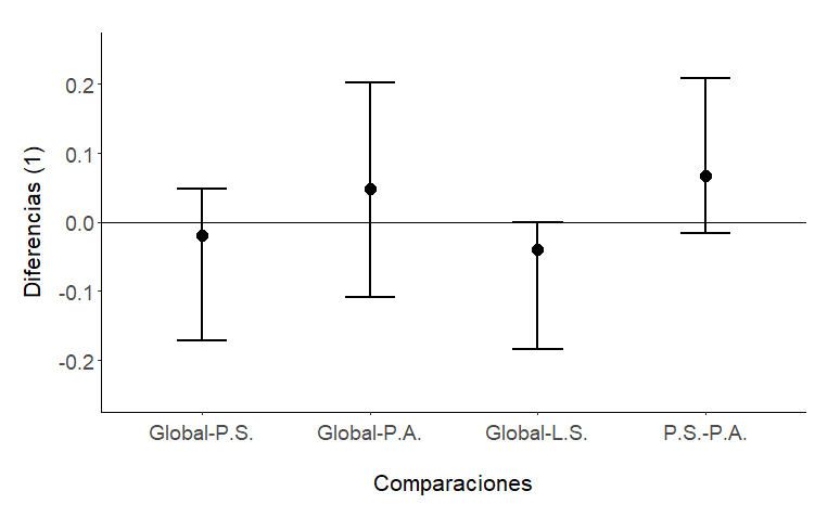 De esta forma, todos los FC estimados presentan valores entre 1,2 y 1,3, dándose la mayor diferencia entre el primer y el tercer grupo considerados. Aunque podría considerar el uso de un factor de corrección distinto dependiendo del escenario evaluado dadas las diferencias observadas entre los grupos, es claro que existe concordancia numérica entre todos los factores de corrección estimados por la metodología aplicada en el presente estudio. La evaluación de la comparabilidad entre los FC mediante la estimación de intervalos de cobertura al 95 % para sus poblaciones simuladas se muestra en la Fig. 6. Todos los intervalos evaluados incluyen el 0 (elemento nulo), por lo que puede concluirse que no existe diferencia significativa entre las poblaciones de los factores de corrección FC. Debe recordarse que el escenario de límites simétricos (Lim. Sim.) corresponde a un caso particular del escenario de proyección simétrica de los límites (Proy. Sim.), por lo que no se considera necesario hace la comparación del primero con los resultados del escenario de proyección asimétrica de los límites (Proy. Asim.).