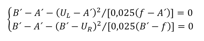 La segunda incertidumbre estándar, denotada como u 95, considera que los valores extremos simulados corresponden a los límites de un intervalo que abarca el 95 % de los valores de la distribución. Es decir, que los valores extremos representan un intervalo de cobertura del 95 %. Para diferenciarlos de los límites al 100 % (A y B), estos límites al 95 % se denotan como U L (límite inferior) y U R (límite superior). A partir de U Ly U R, se proyectan los límites que corresponderían al intervalo de cobertura del 100 %. Estos límites proyectados se denotan como A’ y B’ ( Fig. 3). Finalmente, se aplica la ecuación (1) para estimar la incertidumbre estándar u 95, considerando nuevamente al valor central usado para la simulación como f y los límites proyectados A’ y B’ como A y B respectivamente. Las metodologías utilizadas para la proyección y estimación de los límites A’ y B’ se detallan a continuación.