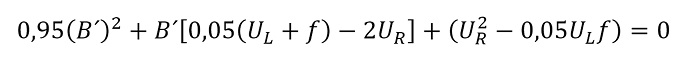 La segunda interpretación, correspondiente al enfoque asimétrico no tradicional (proyección asimétrica), parte de que el 5 % restante de la distribución se encuentra en su totalidad por encima de U R (triángulo rojo en la Fig. 3b). Esta puede considerarse cuando la variable de interés sólo puede tener valores positivos y el límite inferior U L es muy cercano o igual a 0, por lo que la distribución no debería incluir valores por debajo de U L ya que podrían implicar la presencia de valores negativos asociados a la variable de interés. Esta situación puede presentarse para algunos factores de emisión de GEI encontrados en la literatura, por lo que se considera pertinente su inclusión en el presente estudio. De esta manera, el valor de A’ correspondería al mismo valor de U L, mientras que el valor de B’ puede ser estimado geométricamente a partir del área del triángulo formado por fuera del intervalo de cobertura del 95 %, mediante la solución de la ecuación (3).