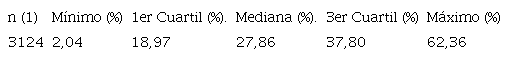 El Cuadro I muestra un resumen estadístico de las incertidumbres estimadas u 100 a partir de la ecuación (1) para todos los 3124 casos evaluados. Para facilitar su presentación e interpretación, estas se presentan en forma porcentual, relativa con respecto al valor central f.