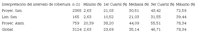 El Cuadro II muestra un resumen estadístico de las incertidumbres estimadas u 95 a partir de la ecuación (1) para los 2365 casos evaluados (75,7 %) con el uso de la ecuación (2) (interpretación simétrica tradicional del intervalo de cobertura al 95 %) y para los restantes 759 casos evaluados (24,3 %) con el uso de la ecuación (3)(interpretación asimétrica no tradicional del intervalo de cobertura al 95 %). Para facilitar su presentación e interpretación, estas se presentan en forma porcentual, relativa con respecto al valor central f. La base de datos completa, con las estimaciones de u 100, A’, B’, u 95 y la razón entre u 95 y u 100( FC), se incluye dentro del material suplementario del presente estudio.