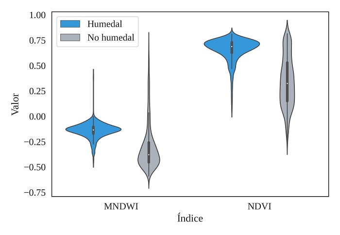 En total, se ubicaron 834 puntos de muestreo en la categoría humedal, y 783 puntos en la categoría no humedal. Se realizó un análisis descriptivo, a partir de gráficas de violines, para determinar los posibles valores de cada índice que podrían separar ambas categorías. La clasificación automática consistió en crear un mapa binario con las categorías humedal y no humedal. La categoría humedal se asignó a los píxeles cuyo valor se encontraba por encima del cuartil 1 de cada índice de forma simultánea. La categoría no humedal se asignó cuando el valor del píxel era menor al cuartil 1 de uno o ambos índices. Los resultados del mapa binario se validaron comparando la categoría asignada a cada píxel a partir del criterio estadístico descrito y la categoría original de cada punto de muestreo. La calidad del mapa binario se evaluó con los parámetros de precisión (relación entre positivos reales y falsos positivos), exhaustividad (relación entre positivos reales y falsos negativos), el valor F1 (promedio harmónico de la precisión y la exhaustividad con ambos parámetros con igual importancia), y el índice Kappa (probabilidad del resultado de ser diferente a un resultado al azar) [27], [28].
