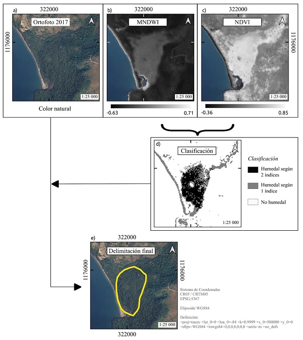 El mapa binario de posibles humedales se utilizó como guía para identificar posibles zonas no mostradas en el INH. La delimitación final de los humedales costeros se realizó de forma manual utilizando en conjunto las ortofotos de 2017 y el mapa binario derivado de los índices. En las zonas donde se mostraron parches de píxeles con categoría humedal, se consultó la imagen aérea y se digitalizó el polígono que contendría la masa boscosa asociada a dicho parche identificado en el mapa binario. De ser necesario, se consultaron los mapas de índices NDVI y MNDWI para separar adecuadamente la vegetación en zonas húmedas de la vegetación colindante en zonas más secas y con menor probabilidad de ser humedales. En los casos en que se identificaron humedales ya incluidos en el INH, se comprobó, con la ortofoto, que la delimitación mostrada en esas fuentes fuera coherente con la masa boscosa vista en la imagen aérea.