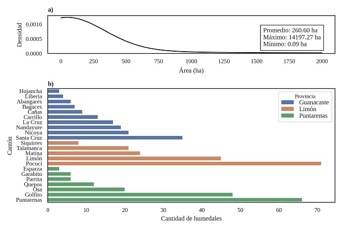 En términos de división administrativa ( Fig. 3.b), la provincia que tiene más humedales es Limón, con 169, seguido de Puntarenas con 161 humedales y Guanacaste con 134 humedales. Dentro de ellas, el cantón que presenta más cantidad de humedales es Pococí en la provincia de Limón, seguido de Puntarenas y Golfito en la provincia de Puntarenas. Los cantones con menor cantidad son Hojancha en Guanacaste y Esparza en Puntarenas, con tres cada uno.