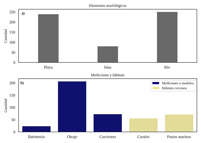 Con relación a la disponibilidad de información medida o simulada de oleajes, corrientes y batimetría, 207 humedales costeros tienen datos de oleajes, 73 tienen datos de corrientes, y 24 tienen información de la batimetría ( Fig. 4.b). Todos estos datos fueron generados en la costa aledaña al humedal (no dentro del propio humedal), y han sido obtenidos por IMARES-UCR a través de proyectos de investigación y consultorías. Este aspecto podría facilitar futuras investigaciones realizadas por otras entidades científicas, ya que los datos medidos y modelados por IMARES-UCR pueden distribuirse bajo licencias favorables para proyectos de investigación.