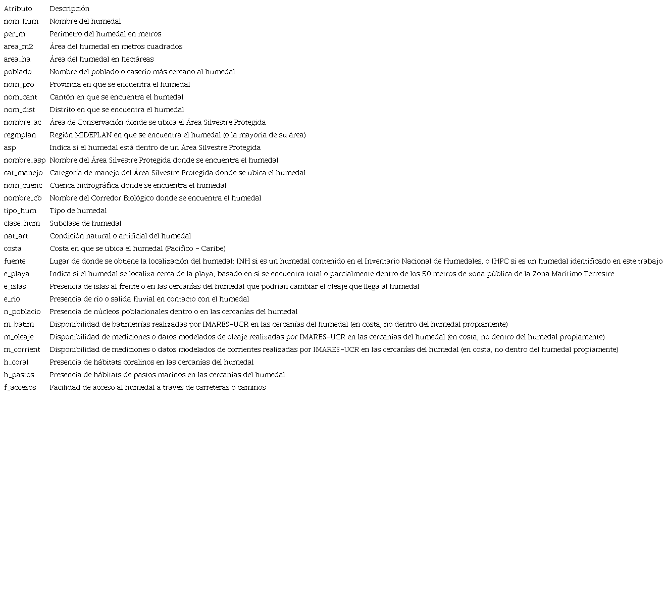 El inventario se desarrolló con los mismos atributos del INH, de forma que sea compatible con él en estudios que requieran utilizar ambas fuentes. Además, se agregaron atributos nuevos que contienen información particular que podría ser útil en estudios de protección costera basada en naturaleza. Los detalles de cada atributo se pueden consultar en el CUADRO I. Los nuevos atributos recogen información de las características morfológicas de las cercanías del humedal (e.g. hay elementos como islas, playa, río), si existen mediciones batimétricas, si se cuenta con datos medidos o de modelos numéricos de variables hidrodinámicas, si el humedal tiene dentro o en sus cercanías un núcleo de población considerable, si existen registros de otros ecosistemas que puedan contribuir a la protección costera en las cercanías del humedal, y si el humedal tiene acceso por carreteras de la red vial nacional.