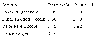 En la Fig. 2.b y 2.c, se muestra cómo el índice MNDWI permite identificar, con valores más altos, las posibles áreas de humedal, y el NDVI separa zonas con vegetación densa (como la presente en los manglares) de áreas con vegetación menos densa, superficies artificiales, o zonas con agua (ríos, mar, nubes). Así, la combinación de los índices MNDWI y NDVI produce un mapa intermedio con píxeles identificados como humedal por ambos índices, píxeles identificados solo por un índice, y píxeles no identificados como humedal. Para la clasificación final, solo se consideraron como humedal los píxeles en que ambos índices coinciden ( Fig. 2.d). Esta definición se considera aceptable dados los parámetros de calidad que muestran una clasificación buena para la categoría de humedal ( CUADRO II), con valores que indican que casi la totalidad de píxeles mostrados como humedal son correctos (precisión=0.99), más de la mitad de píxeles de humedal han sido correctamente identificados (exhaustividad=0.60), y el promedio ponderado de precisión y exhaustividad muestran una clasificación aceptable (valor F=0.75). Además, el índice Kappa de 0.6 muestra una clasificación de ajuste moderado entre los valores reales y los clasificados [28].