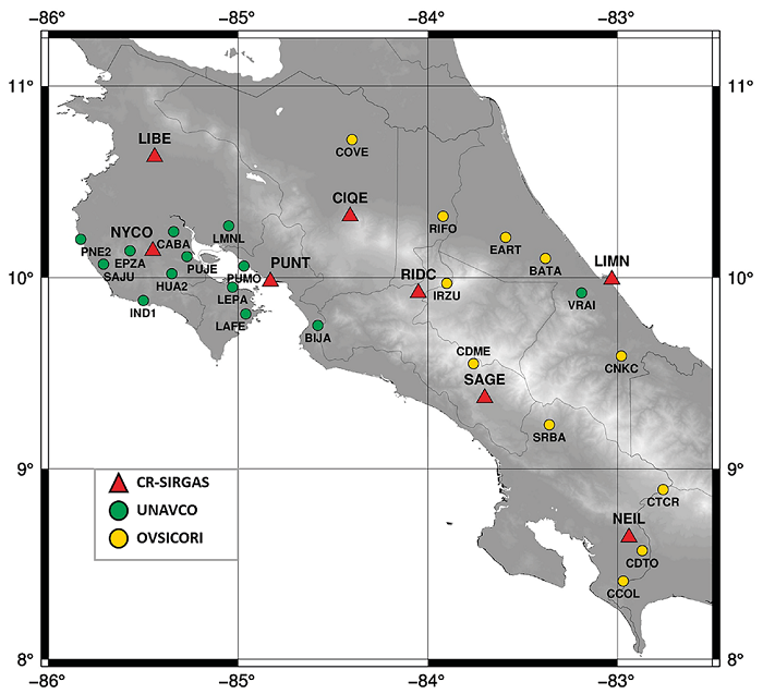 La distribución espacial de los puntos se presenta en la Fig. 1, donde las estaciones fijas CR-SIRGAS se identifican con un triángulo de color rojo, y las estaciones nuevas con círculos de color verde y amarillo, dependiendo de la fuente de datos.