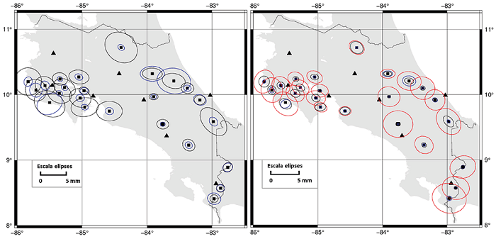 En los apartados anteriores, se ha expuesto que la exactitud de las coordenadas ajustadas de los puntos nuevos en el ajuste 2019,24 baja considerablemente respecto a dos resultados. En las tres determinaciones, la excentricidad promedio de las elipses fue 0,588, sin embargo, el aumento en los ejes para las elipses en el ajuste 2019,24 estuvo entre 1,5 y 15. La representación de estas regiones de confianza se presenta en la Fig. 10, donde a la derecha se presentan en conjunto las elipses obtenidas de los ajustes 2021,53 y CR-SIRGAS dibujadas aumentadas en un factor 250, y, a la derecha, se agregan, en color rojo, las elipses del ajuste 2019,24 y se mantuvo la escala para destacar las diferencias. El azimut del semieje mayor prácticamente se mantuvo invariable en los tres casos.