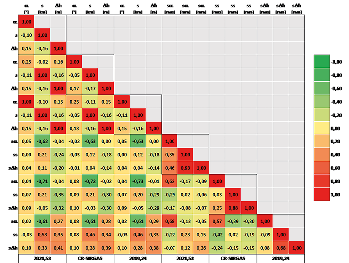 En la misma Fig. 11, se puede observar, por un lado, que las componentes ajustadas de cada uno de los vectores en las tres épocas son prácticamente independientes con un coeficiente de correlación promedio de -0,02, sin embargo, las componentes de distancia y diferencia de altura entre las distintas épocas están totalmente correlacionadas, así como la componente de azimut solamente entre las épocas 2021,53 y 2019,24. Por otro lado, se observa que las exactitudes en las componentes de distancia y diferencia de altura están altamente correlacionadas en las tres épocas, llegando a un valor promedio de +0,82. Se ve, además, que las exactitudes en la componente angular están medianamente relacionadas con las respectivas exactitudes en distancia y diferencia de altura solamente en la época 2021,53. Este comportamiento no se repite para CR-SIRGAS ni 2019,24. Luego, las correlaciones entre los grupos de datos tienen diferentes valores, destacándose la relación inversa entre las distancia s y la exactitud azimutal sa con un promedio de correlación de -0,65 en todas las épocas.