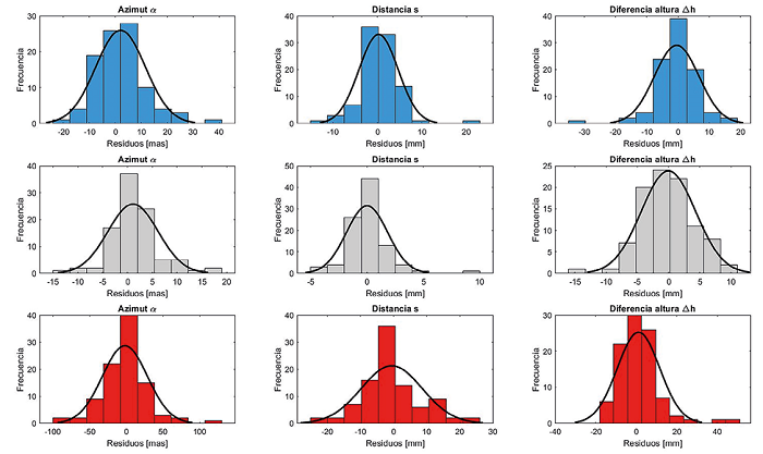 Los residuales son las correcciones que proporciona el algoritmo de ajuste a las observaciones originales. En el conjunto de gráficos de la Fig. 12, se presenta su distribución por época de ajuste y su tipo de magnitud. Superpuesta, se grafica la curva de la función de densidad en color negro. En las filas de arriba hacia abajo, se muestran los resultados generados por los ajustes relativos a 2021,53, CR-SIRGAS y 2019,24 y, en las columnas de izquierda a derecha, se presentan las componentes elipsoídicas de azimut, distancia y diferencia de altura, respectivamente. En los gráficos de la figura, se observa, evidentemente, que los residuos son aleatorios y que se distribuyen de una manera prácticamente normal. Además, se nota que, en el caso del ajuste CR-SIRGAS, las tres componentes tienen una dispersión menor, aproximadamente la mitad al compararla con el ajuste 2021,53. Sin embargo la dispersión de los residuales en el ajuste 2019,24 es mucho mayor en todas las componentes, lo cual implica que se tuvieron valores individuales que se alejan del valor central. Debe también indicarse que, en todos los setenta y dos procesos de ajuste realizados, no hubo evidencia estadística de observaciones groseras.