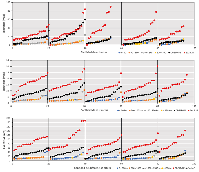En el conjunto de gráficos de la Fig. 13 se presentan las exactitudes obtenidas de los procesos de ajuste respecto a las tres épocas analizadas. En el eje vertical, se tiene la magnitud de la exactitud y, en el eje horizontal, los valores de cada una de las líneas base ordenadas de manera ascendente. El objetivo es mostrar el comportamiento de la exactitud en función de su componente respectiva.