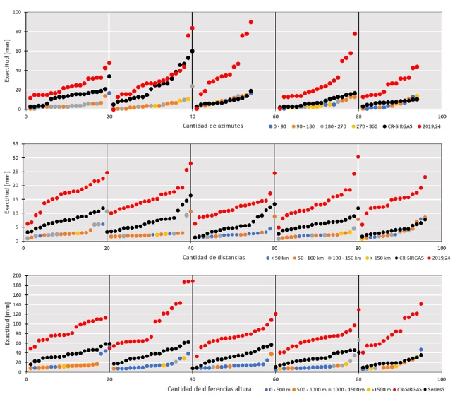 La idea general de la Fig. 14 es mostrar el comportamiento de la exactitud en cada componente independientemente del valor de la observación. Se nota que la exactitud en el ajuste 2019,24 es visiblemente más baja con respecto a los valores logrados en 2015,53 y en CR-SIRGAS. Particularmente la componente azimutal en esta época presentó valores que superaron los ±100 mas (10-3 segundos) de exactitud. Fue, por esta razón, que se decidió eliminar esas observaciones del gráfico con lo cual se logró que en la escala vertical se aprecien los valores del resto de observaciones. Se recalca el hecho de que, aunque la exactitud en algunos azimuts fue superior a los ±100 mas, estadísticamente no se catalogaron como observaciones groseras. Aun así, se notan observaciones en el bloque de las veinte a las ochenta observaciones cuya exactitud decrece a más de ±60 mas. Se aprecia, además, cómo las exactitudes obtenidas en 2021,53 y CR-SIRGAS prácticamente coinciden en el bloque de las cuarenta a las noventa y seis observaciones, mientras que en los dos primeros bloques se tiene un comportamiento aleatorio para CR-SIRGAS y 2019,24 respecto a 2021,53. En el caso de las distancias elipsoídicas, los resultados de la exactitud tienen un comportamiento que se catalogó como similar en los primeros cuatro bloques y,, en el quinto bloque, 2021,53 y CR-SIRGAS prácticamente coinciden y quedando por debajo de los ± 10 mm. En todos los bloques de observaciones, se evidencia la disminución de la exactitud en 2019,24 con valores que alcanzan los ± 30 mm. Las observaciones de diferencias de altura elipsoídicas se graficaron calculando el valor absoluto de la observación para facilitar la interpretación del gráfico. Se evidencia que estas observaciones en 2021,53 se mantienen por debajo de los ± 20 mm con una alta coincidencia en el último bloque de observaciones. Con respecto a CR-SIRGAS, la exactitud estuvo en los ± 20 mm y los ± 60 mm. Sin embargo, la exactitud vertical de 2019,24 alcanza un rango entre los ± 60 mm y los ± 140 mm con tres observaciones que superan los ± 180 mm.