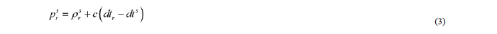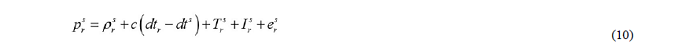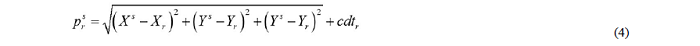 Aunque los relojes en los satélites sean monitoreados constantemente en la relación con la escala de tiempo propia de cada sistema, y que esa información se conoce en el mensaje de navegación, se mantiene la falta de sincronización en los relojes de los receptores dt r, implicando así que la ecuación (3) adquiera la forma que se presenta en la ecuación (4), es decir, en función de las coordenadas del satélite, las coordenadas del receptor más una distancia resultado del producto de la falta de sincronización del reloj del receptor por la velocidad de la luz en vacío.