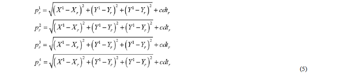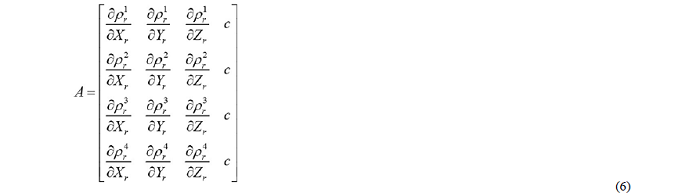 En la ecuación anterior, hay un total de cuatro incógnitas, las tres coordenadas (Xr, Yr, Zr) de la posición de la antena y la falta de sincronización en el reloj del receptor dt r, conocida como estado del reloj del receptor. Su solución matemática necesita conocer al menos un total de cuatro pseudodistancias. Se tendrá, ahora, un sistema de ecuaciones de tamaño 4 x 4 similar al presentado en el conjunto de ecuaciones (5) y que requiere ser linealizado [5] y [8].