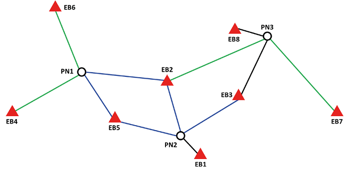 En la Fig. 2, se presenta, de manera esquemática, el criterio de selección usado en la escogencia de las estaciones de vínculo para cada uno de los puntos nuevos. Los triángulos de color rojo representan estaciones GNSS de operación continua (estaciones fijas CR-SIRGAS) y los círculos representan las estaciones nuevas. La codificación de las líneas contempló vectores de tamaño “corto” en color negro, los vectores de longitud “media” en color azul y los vectores de longitud “larga” en color verde. Las comillas en los adjetivos anteriores se colocaron solamente para clasificar distancias en esas tres categorías y solo con ese efecto ya que el término corto, medio y larga puede tener diferentes connotaciones. Por ejemplo, el punto PN1 se enlazó a las estaciones conocidas EB6, EB2, EB5 y EB4 en donde se aprecian dos vectores de longitud media y dos de longitud larga. En el caso del punto PN2, se enlazó a las estaciones EB2, EB3, EB1 y EB5 que tiene tres vectores de longitud media y uno de longitud corta. Finalmente, en el caso de PN3, se vinculó a las estaciones EB7, EB3, EB2 y EB8 en las que hay dos vectores cortos y dos vectores de longitud larga.