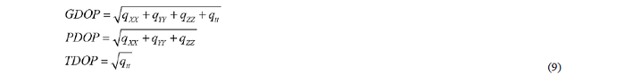 Una serie de elementos estocásticos presentes en la medición de cada distancia, desde el satélite hasta el receptor, se agrupan en el factor denominado UERE ( User Equivalent Range Error) que se envía en el mensaje de navegación, el cual, en combinación con el parámetro DOP ( Dilution Of Precision), permite hacer una estimación de la exactitud en el posicionamiento de un punto. El DOP es un escalar indicador de la calidad del proceso de ajuste ligado a la geometría de los satélites que se tuvieron en vista. Un valor bajo de DOP representa una buena geometría, es decir, con satélites bien distribuidos en el horizonte, mientras que un valor alto implicará una geometría deficiente. Este factor es llamado, generalmente, pérdida de la precisión geométrica (GDOP), el cual brindará información de la posición al no considerar el término q tt e informará sobre el parámetro de tiempo si solamente se considera dicho término [8] y [10]. Los diferentes parámetros DOP se calculan tal como se muestra en el conjunto de ecuaciones (9).