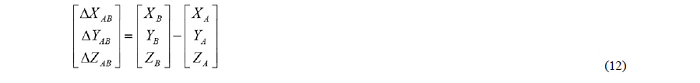 Dentro de las posibilidades que se ofrecen en las metodologías de levantamiento GNSS, está la denominada estática relativa por medición de fase en la cual el principio básico consiste en tener al menos dos receptores que estén observando simultáneamente a un mismo conjunto de satélites durante un determinado tiempo. La relación directa entre ambos receptores está dada, de manera geométrica, por la denominada línea base, que es un vector espacial calculado a partir del procesamiento de las mediciones GNSS en ambos puntos. Por ejemplo, si se tienen dos puntos A y B, y se asume inicialmente A como fijo, se requiere de los incrementos de coordenadas entre ambos. En la ecuación (12), se presenta el caso concreto para dos puntos A y B [8]- [10].