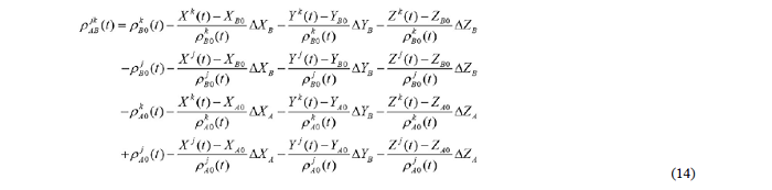 Si se multiplica la ecuación anterior por λ, el primer término de la derecha representa las pseudodistancias medidas desde los dos satélites a los dos puntos y cada una de estas tres ecuaciones debe ser linealizada. El resultado de este proceso se presenta en la ecuación (14), donde los subíndices cero se refieren a la aplicación de la serie de Taylor la cual requiere de valores aproximados de las incógnitas [8].