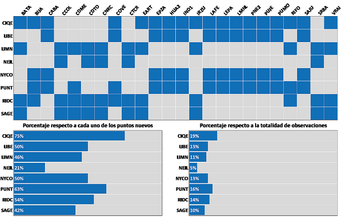 El procesamiento de las líneas base se realizó con el software comercial Trimble Bussines Center (TBC) versión 5.2 con licencia de la Escuela de Topografía, Catastro y Geodesia (ETCG) de la Universidad Nacional (UNA). Por un lado, en la parte superior de la Fig. 3, se representa el vínculo entre la estación fija y la estación nueva con los cuadros de color azul; en la parte inferior a la izquierda se muestra el porcentaje de ocasiones en las que la estación fija fue considerada por cada punto nuevo. Por otro lado, a la derecha de la figura, se tiene el porcentaje respecto a la totalidad de las líneas base usadas. En total, se procesaron noventa y seis vectores contemplando, para las ocho estaciones CR-SIRGAS, los archivos de coordenadas semanales finales SIRGAS disponibles en: https://www.sirgas.org/en/weekly-solutions/, así como archivos de órbitas finales del International GNSS Service (IGS), los cuales se pueden descargar en: https://igs.org/products-access/.