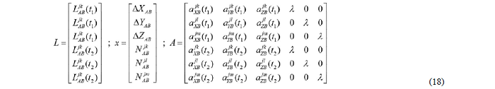 Si se toman ahora, por ejemplo, cuatro satélites j, k, l, m en dos instantes de tiempo t 1 y t 2, se tiene en el conjunto de ecuaciones (18), la forma del vector de observaciones L, del vector de incógnitas x y de la matriz de configuración A[8].