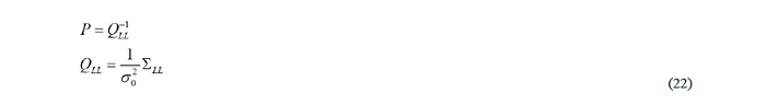 El modelo matemático del ajuste por mínimos cuadrados contempla dos partes denominadas modelo funcional y modelo estocástico. El primero establece las relaciones funcionales entre las observaciones y las incógnitas, el segundo, considera la matriz P de pesos de las observaciones que es la inversa de la matriz de factores y cofactores de las observaciones originales denominada Q LL y esta depende del inverso de un factor denominado varianza de referencia teórica σ 20 , el cual consiste en un valor adimensionado de referencia establecido inicialmente y que se aplica como un escalar a la matriz de varianza-covarianza Σ LL[6], [8]. La situación descrita se presenta en el conjunto de ecuaciones (22).