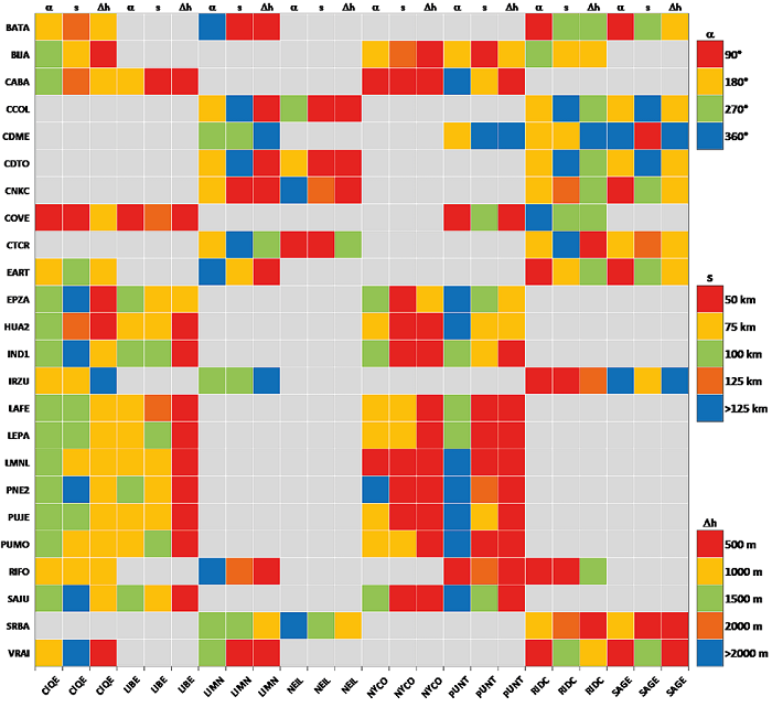 Con el fin de dar una idea del valor de la magnitud de las componentes elipsoídicas de cada uno de los vectores, en la Fig. 4, se presenta una matriz que reúne la clasificación por magnitud de cada uno de los tres tipos de componente del vector (α, s y Δh). La codificación de colores se tiene en la parte de la derecha en la cual cada una de las magnitudes debe leerse considerando los intervalos en los que se encuentra la observación. En el caso de los azimuts α, se establecieron cuatro rangos: valores menores o iguales a 90º en color rojo, valores entre 90º y 180º en color amarillo, valores entre 180º y 270º en color verde y valores mayores a 270º y menores que 360º en color azul. En lo que respecta a las distancias s y a las diferencias de altura Δh, el color azul representa magnitudes mayores a los 125 km y 2000 m, respectivamente. En el caso de las diferencias de altura, se tomó el valor absoluto de la observación para facilitar la interpretación.