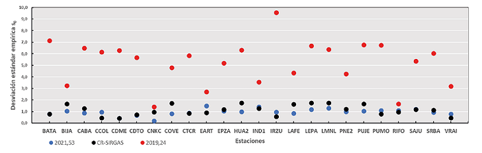 Se aprecia cómo los resultados de este parámetro estadístico para el caso del ajuste en la época 2019,24 con observaciones realizadas en 2021,53 (círculo de color rojo) son mayores que los logrados en los dos procesos en los que se usó correspondencia de observaciones y coordenadas. Estos valores estuvieron comprendidos en un rango entre 1,5 y 9,5 explicando que a los ajustes realizados en esta época se les aplicó un equilibrio de varianzas. Es decir, este factor aumentó la varianza de referencia inicial para lograr la aceptación del modelo matemático, lo que implicó una reducción en la calidad de los resultados, como se verá en los siguientes apartados.