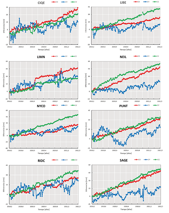 CR-SIRGAS es un marco geodésico que puede ser catalogado como semicinemático y los cambios en las coordenadas de sus estaciones pueden usarse para calcular coordenadas en diferentes instantes [15], [16]. De esta manera, las variaciones semanales en las coordenadas de vínculo como respuesta a la cinemática del país, es un aspecto que indudablemente influirá en los resultados de observaciones tomadas en diferentes épocas de observación t i[4]. Las variaciones en las coordenadas de las estaciones del marco nacional CR-SIRGAS se obtienen a partir de los archivos de coordenadas semanales finales de SIRGAS. A partir de estas, se presentan, en la Fig. 6, sus series temporales entre la época 2019,25 y la 2021,53. Concomitantemente, el CUADRO II muestra el rango de variación por coordenadas para cada una de esas estaciones en el intervalo de tiempo considerado.