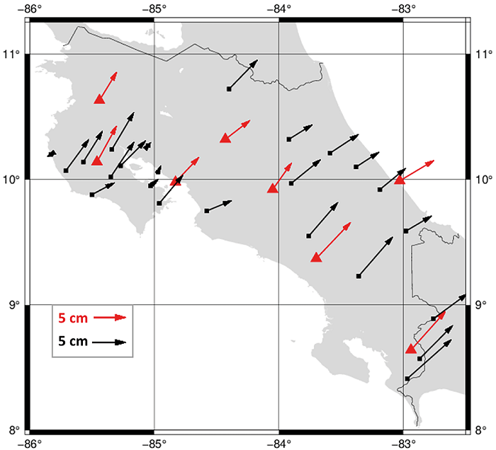 Se nota cómo la dirección y magnitud de los vectores responde efectivamente con el movimiento esperado que sigue el país al estar ubicado sobre la Placa Caribe e influenciado por la Placa Cocos [18]. En este proyecto particular, se tuvo un desplazamiento promedio 4,82 cm que representan unos 2,1 cm por año en un azimut promedio de 55° para los puntos nuevos, mientras que las estaciones CR-SIRGAS tuvieron una magnitud de 5,75 cm es decir unos 2,5 cm por año en un azimut promedio de 42° [4] y [18].