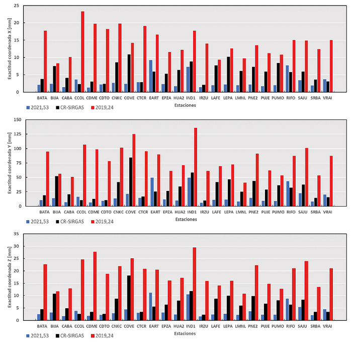En el conjunto de gráficos de la Fig. 8, se presentan por medio barras verticales, la exactitud en las coordenadas geocéntricas para cada uno de los veinticuatro puntos nuevos. Se aprecia que en el caso de las coordenadas X y Z, para los resultados de 2021,53, los valores son menores a ± 5 mm. En el caso de la coordenada Y, como es de esperar, se tienen valores menores a los ± 25 mm, excepto en los puntos EART, IND1 y RIFO. En los resultados del ajuste CR-SIRGAS, el comportamiento general de la exactitud en las coordenadas X y Z se mantiene en ± 10 mm, exceptuando el punto COVE, mientras que en la coordenada Y los valores están por debajo de los ± 50 mm, con excepción en los puntos COVE e IND1. En el caso de los resultados en 2019,24, las barras de color rojo presentan valores elevados (ver CUADRO IV) respecto a los casos 2021,53 y CR-SIRGAS, llegando a ± 25 mm para CCOL en X, más de ± 125 mm en IND1 para la coordenada Y, y casi ± 30 mm en Z para la misma estación IND1.