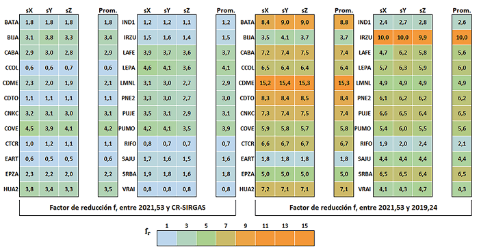 El efecto de las discrepancias entre las exactitudes de las coordenadas ajustadas obtenidas de los resultados de los procesamientos de CR-SIRGAS y 2019,24 respecto a 2021,53, se cuantificó utilizando un factor de reducción f r, el cual tendrá valores menores, iguales o mayores que la unidad representando incremento, igual o pérdida de exactitud respectivamente. Estos valores se presentan en la Fig. 9 donde se hizo una codificación de colores para facilitar la identificación del f r y en la cual, adicionalmente, se calculó el promedio de este factor. Se nota en el bloque de la izquierda que el promedio del f r se encuentra entre 0,6 y 4,2, mientras que en el bloque de la derecha el promedio aumenta a un rango entre 1,8 y 15,3. En esta figura, se evidencia también un elemento sistemático en cada una de las comparaciones por cada una de las coordenadas. el cual puede ser atribuido precisamente a que el marco CR-SIRGAS es cinemático y, por lo tanto, las coordenadas de sus estaciones presentaron variaciones constantes de este estudio.