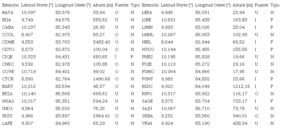 Para la realización de este estudio, se usó un total de tres fuentes de datos. La primera corresponde a los archivos de observación de las ocho estaciones que sustentan actualmente el marco geodésico nacional CR-SIRGAS [1], administradas por el IGNCR. Los archivos de observación de dichas estaciones se pueden descargar de manera gratuita en el enlace: https://gnss.rnp.go.cr/SBC. La segunda fuente la conforma un grupo de archivos de datos pertenecientes a un conjunto de estaciones GNSS de operación continua, ubicado principalmente en el sector occidental de Costa Rica y son parte de un proyecto de investigación desarrollado por UNAVCO en colaboración con el Observatorio Vulcanológico y Sismológico de Costa Rica (OVSICORI) [11]. Los archivos de observación de esta fuente se descargan gratuitamente en: https://data.unavco.org/archive/gnss/rinex/. Finalmente, la tercera fuente de datos consultada fue el conjunto de archivos de observación solicitado directamente vía correo electrónico al OVSICORI. En el CUADRO I, se presentan las coordenadas geodésicas aproximadas de las treinta y dos estaciones usadas, la fuente de datos consultada y el tipo de punto. En este estudio, las ocho estaciones de CR-SIRGAS se consideraron fijas y las veinticuatro estaciones restantes se tomaron como nuevas.