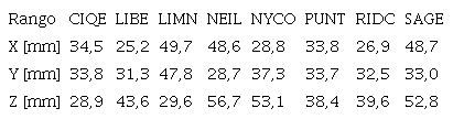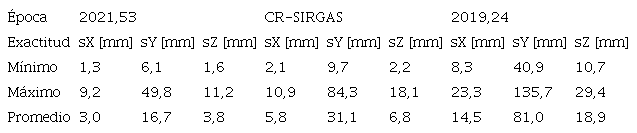Se lograron también cuantificar las diferencias en las coordenadas ajustadas obtenidas con observaciones registradas en la épocas 2019,24 y 2021,53 y llevadas estas últimas a la época 2019,24. Los resultados demostraron que la diferencia en las coordenadas cartesianas geocéntricas ajustadas en 2019,24 está entre los 4,1 mm y 5,2 mm ( CUADRO III); aunque la diferencia es pequeña, la misma debe ser analizada en concordancia con la exactitud en las coordenadas ajustadas, la cual disminuye presentando valores entre ± 8 mm y ± 136 mm ( CUADRO IV y Fig. 8) y con la respectiva disminución de la exactitud de las observaciones ajustadas (ver Fig. 13 y 14).