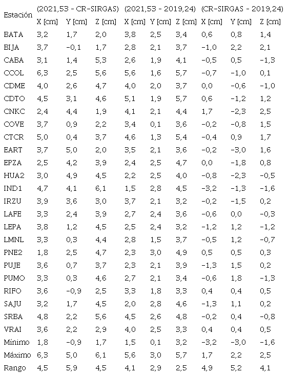 La salida del programa de procesamiento brinda tres tipos de coordenadas ajustadas para los puntos nuevos: coordenadas cartesianas geocéntricas (X, Y, Z), coordenadas geodésicas elipsoídicas (φ, λ, h) y coordenadas cartográficas planas (N, E), en este caso, en la proyección nacional Costa Rica Transversa Mercator (CRTM05), acompañada de una estimación de la altura nivelada (H) del punto obtenida por medio de la diferencia entre la altura geodésica h y el valor de la ondulación del geoide N para el punto según el modelo EGM2008 [17]. En el CUADRO III, se presentan los resultados de las diferencias en coordenadas cartesianas geocéntricas entre las tres épocas consideradas. Se nota, en la comparación CR-SIRGAS y 2019,24, que los valores de las diferencias son menores respecto a las otras dos comparaciones. Esto se debe a que se usó la misma época y a que las coordenadas obtenidas en 2019,24 están ajustadas, es decir, el algoritmo de ajuste por mínimos cuadrados genera una solución de coordenadas sacrificando, en este caso particular, la geometría de la red y la exactitud de las coordenadas. Esta situación debe complementarse con el análisis de los residuos y las exactitudes de las observaciones ajustadas.