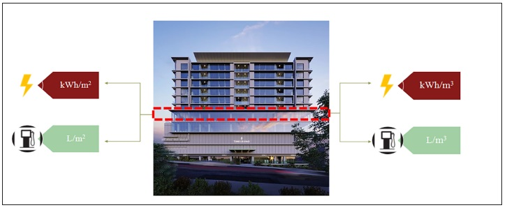 Como resultado se obtuvieron indicadores de consumo de electricidad y combustible para cada uno de los niveles del edificio expresados de la forma: “kilo watt por hora de electricidad por metro cuadrado de entrepiso colado” (kWh/m 2), “litros de combustible por metro cuadrado de entrepiso colado” (L/m 2) para todos los niveles de un edificio, “kilo watt por hora de electricidad por metro cúbico de concreto colado por nivel” (kWh/m 3) y “litros de combustible por metro cúbico de concreto colado por nivel” (L/m 3). Esto se muestra gráficamente en la siguiente Fig. 1.