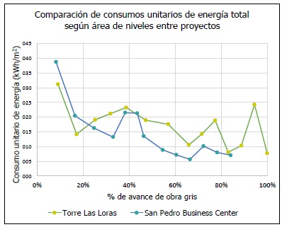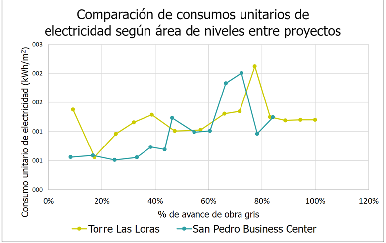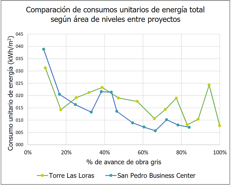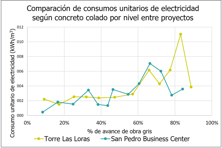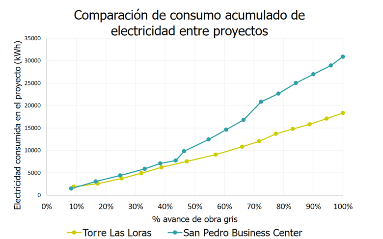 Observando la Fig. 8, el consumo acumulado total de electricidad en kWh, entre ambos proyectos durante el porcentaje de avance de obra gris, SPBC posee un mayor consumo durante todo el proceso y, en la segunda mitad del avance, es notorio el incremento en la cantidad de consumo, esto debido a la energización de la grúa torre.