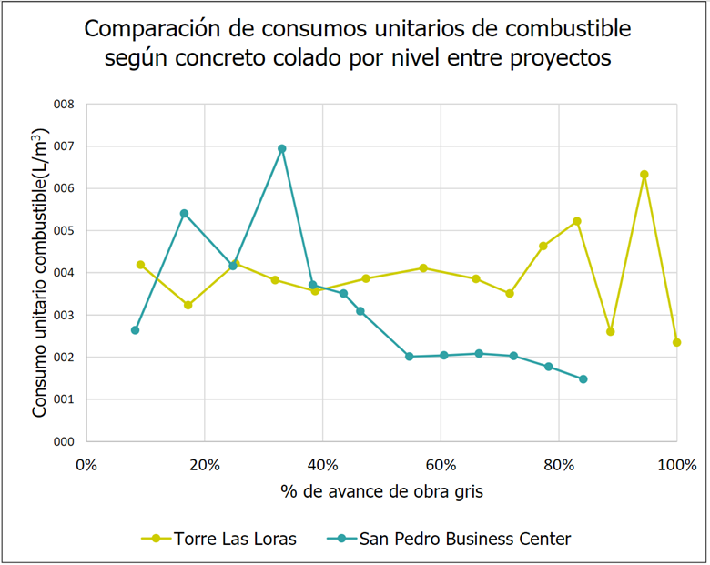 En la siguiente Fig. 12, en el caso de TLL, el consumo unitario mayor se obtiene al inicio del proyecto al construir la cimentación, entre mayor consumo total y menor área por nivel mayor consumo unitario; aunque la cimentación posea el área más grande de construcción, esta posee el mayor consumo de combustible de todos los niveles. Este dato se puede comparar con otros proyectos, debido a que representa el consumo por metros cuadrado de construcción. Además, se puede notar que SPBC posee un alto consumo unitario de combustible al inicio, mayor que TLL, debido a que utilizaban combustible para alimentar la grúa torre. Posteriormente, el consumo unitario de combustible de SPBC disminuyó, consumiendo menos que TLL, al energizar la grúa la torre.