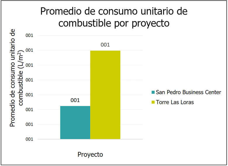 Además, en los siguientes dos gráficos ( Fig. 14 y Fig. 15), se muestran los promedios de consumo unitario según el área de cada nivel para cada proyecto, tanto para el recurso de combustible como para el de electricidad. Con esto, es posible crear un análisis general y global de los consumos para comparar diversos proyectos entre con las mismas metodologías constructivas. Es interesante notar que, aunque TLL posee una menor área que SPBC, este posee mayores consumos unitarios tanto de electricidad como de combustible. En el caso del combustible, la energización de la grúa torre ayudó en gran medida al proyecto SPBC para obtener un ahorro en el consumo de combustible.