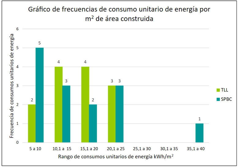 Adicionalmente, como parte de un análisis estadístico, se procedió a elaborar un gráfico ( Fig. 17) comparativo entre los dos proyectos de frecuencias de consumo unitario de energía por m 2 construido. Por lo tanto, se consiguió observar cuáles rangos de consumo unitarios de energía total (sumando electricidad y combustible) en kWh/m 2 se repiten más en ambos edificios. En el caso de SPBC, el rango que más se repite es entre 5 y 10 kWh/m 2, y, en TLL, son de 10 a 15 y de 15 a 20 KWh/m 2, por lo que se podría decir que SPBC posee una mayor eficiencia en términos de consumo energético contra el avance de construcción de obra gris. Sin embargo, en un nivel construido en SPBC, se presentó un consumo unitario mayor a 35 kWh/m 2, este se dio en la construcción de la placa de fundación, la cual coincidió con algunos trabajos de movimiento de tierras y con los fletes de alquiler de equipos como formaletas, lo cual generó un mayor consumo de energía por el uso de combustible. Además, como se ha mencionado anteriormente, al inicio del proyecto SPBC, se utilizaba un generador para la utilización de la grúa torre y, en un proyecto de construcción, esta implica una gran cantidad de consumo.