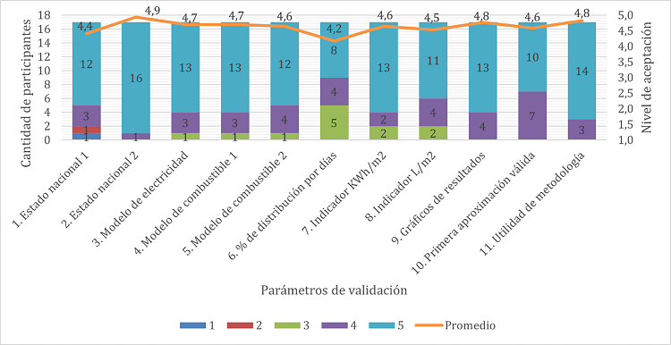 A continuación, se muestran los resultados del cuestionario en el gráfico de la Fig 18, en este, se presenta la cantidad de expertos que estaban completamente de acuerdo, con el número 5 (de color celeste), los que estaban parcialmente de acuerdo, con los números 2, 3 y 4 (de color rojo, verde y morado, respectivamente) y los que se encontraban completamente en desacuerdo, con el número 1 (de color azul). Además, se muestra el promedio de aceptación para cada parámetro de validación.