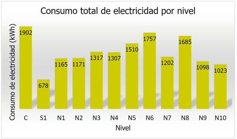 Además, algunos de los resultados con respecto a los consumos generados de energía se presentan a continuación en los siguientes gráficos, donde: 1) “C” significa cimentación; 2) “S1” sótano 1; 3) “PF” placa de fundación; y 4) “N1” nivel 1.