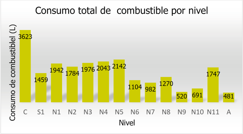 En la siguiente Fig. 5, se muestra el consumo total de combustible para cada uno de los niveles del edificio. La “C” presenta un mayor gasto, debido a que se inició su construcción y simultáneamente se encontraban finalizando algunos trabajos del movimiento de tierras en los cuales se pudo haber utilizado maquinaria que consumiera combustible.